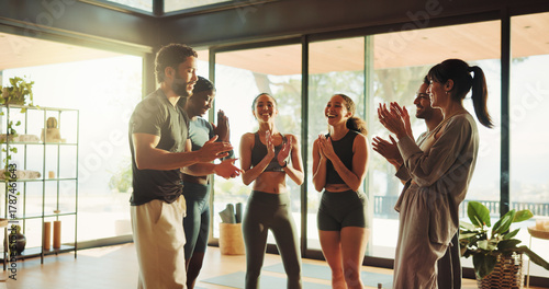 Naklejka premium Fitness, yoga class or people in gym with applause, solidarity or coach recognition in end of training. Pilates, success or instructor in studio with clap, gratitude or finish in wellness club.