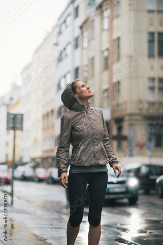 Fototapeta premium Fitness young woman exposed to rain while jogging outdoors