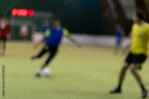 © zphoto83, Fototapeta premium Five-a-side soccer players playing game in indoor stadium on artificial turf.