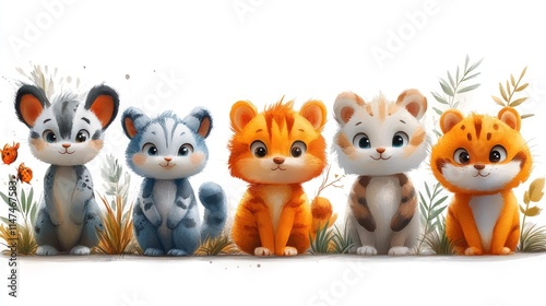 Naklejka premium Five adorable cartoon kittens, grass, white background.