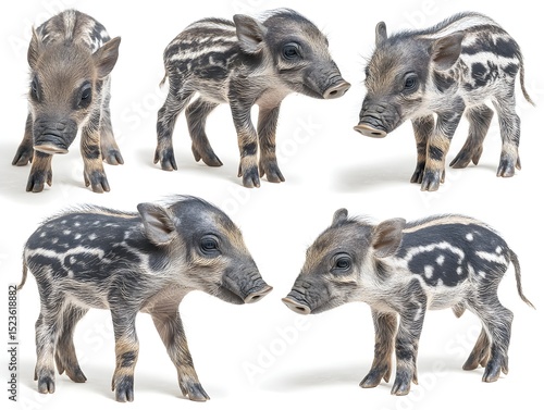 © patiporn, Obraz premium Five adorable wild boar piglets, with brown stripes and spots, pose on a white background for a collage.
