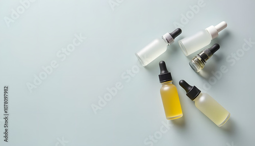 Fototapeta premium Five assorted dropper bottles with various liquids arranged on soft pastel background