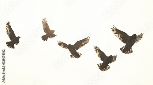© logyartstudios, Obraz premium Five birds in flight, silhouetted against a bright white sky.