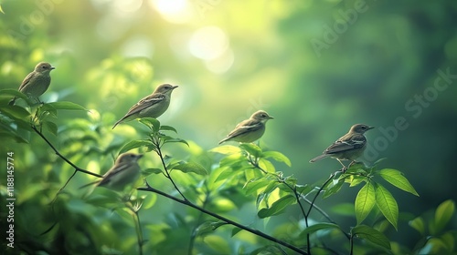 © ellistyaa., Obraz premium Five Birds in Lush Green Foliage: A Serene Nature Scene