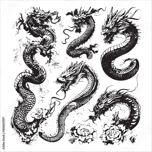 Obraz premium Five black and white stylized dragons swirling among flowers