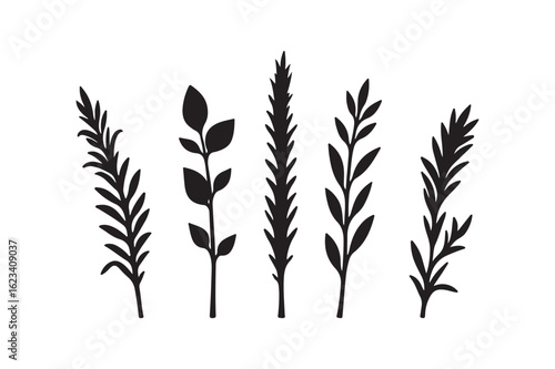 © Sadek, Fototapeta premium Five black silhouette botanical sprigs and branches on white background