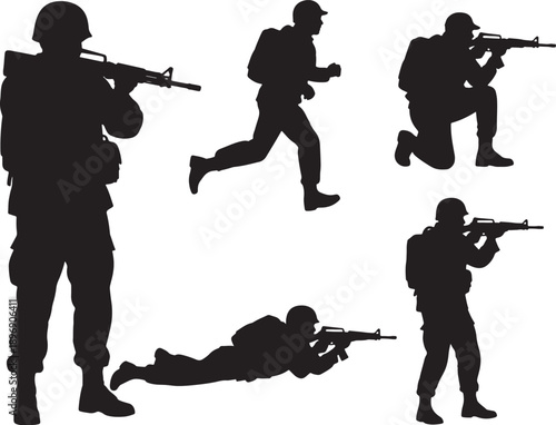 © PixelSaga MH2 , Fototapeta premium Five black silhouette soldiers in various combat poses holding rifles on a white background also transparent background