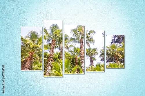 Fototapeta premium Five canvas set isolated on light blue painted wall with palms view posters....