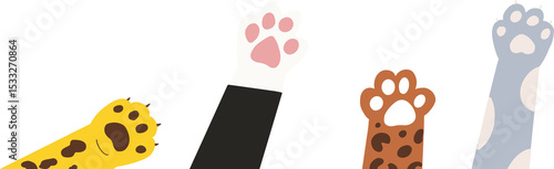 Obraz premium Five cartoon cat paws are rising in flat design with colorful patterns on...