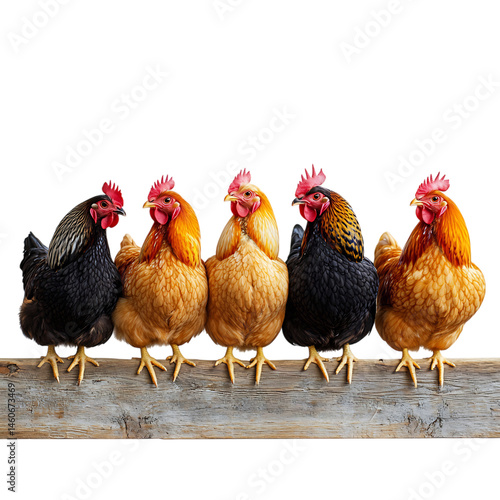 © pngpiko, Fototapeta premium Five Chickens Standing on Wooden Plank Isolated on Transparent Background