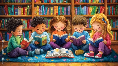Fototapeta premium Five children enjoying storytime in a colorful library setting.