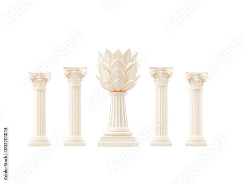 © Rattanathip, Obraz premium Five classical white columns with ornate capitals stand in row, with central column featuring unique lotus flower design, evoking elegance and ancient architecture