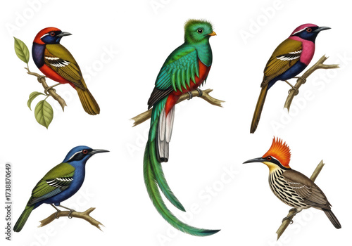 © Jannatul Naima, Obraz premium Five Colorful Tropical Birds Perched On Branches Against Black Background exotic isolated on a transparent background