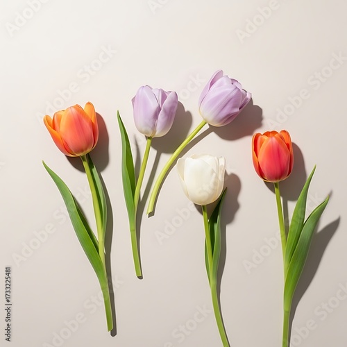 © Arlaya, Fototapeta premium Five Colorful Tulips Arranged Artfully.
