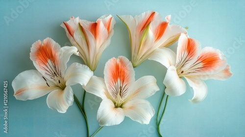 © cllareta, Fototapeta premium Five delicate, peach-and-white Alstroemeria flowers arranged on a pale blue background.