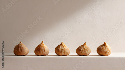 © Tetyana, Obraz premium Five dried figs arranged in a row on a smooth surface, showcasing their unique textures and shapes against a soft, neutral background, highlighting natural beauty and simplicity