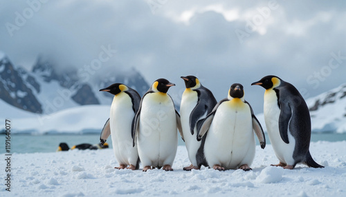 Fototapeta premium Five emperor penguins standing on snow against mountainous background