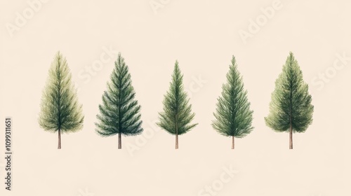 Naklejka premium Five Evergreen Trees - Botanical Illustration
