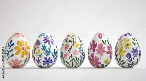 © wahyu bsbt, Fototapeta premium Five floral Easter eggs in a row, white background, spring holiday decoration