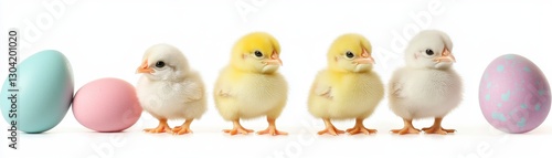 Fototapeta premium Five Fluffy Baby Chicks with Pastel Easter Eggs on White Background