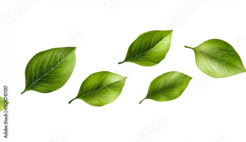Fototapeta premium Five green leaves gently float against a bright white background. The leaves are slightly translucent, with visible veins and subtle texture. Soft lighting creates a peaceful and serene mood.
