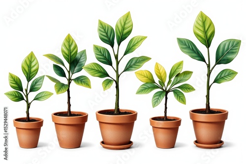 © Ai creative universe, Obraz premium Five Growing Plants in Terracotta Pots Showing Stages of Development and Growth