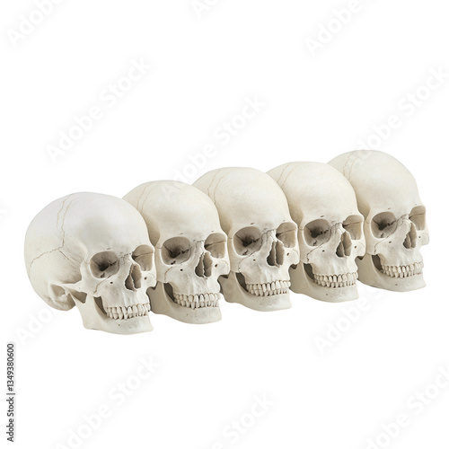 © kiimoshi, Obraz premium Five human skulls in a row on a white isolate background.
