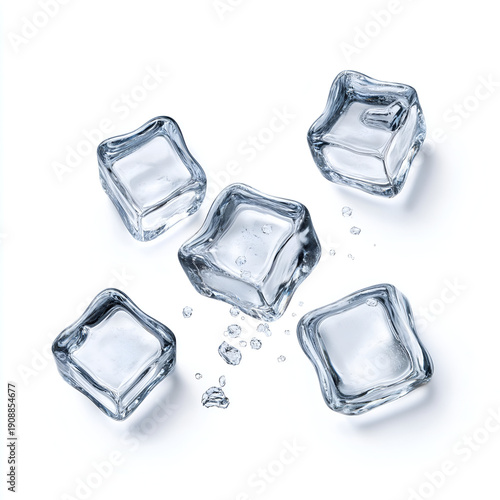 © wannee, Obraz premium Five ice cubes scattered on a white surface, glistening with water droplets, perfect for refreshing beverages.