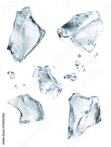 © Al-Mamun, Fototapeta premium Five irregular ice cubes scattered on a black surface isolated on transparent background