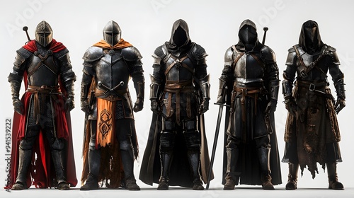 © khunnapat, Naklejka premium Five Knights in Full Armor Medieval Warriors Fantasy Characters Isolated on White Background