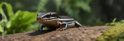 Naklejka premium Five-lined skink perched on a leaf, gazing at the camera with interest,...