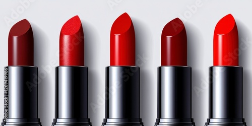 Obraz premium Five lipstick tubes in varying shades of red are arranged in a row against a...