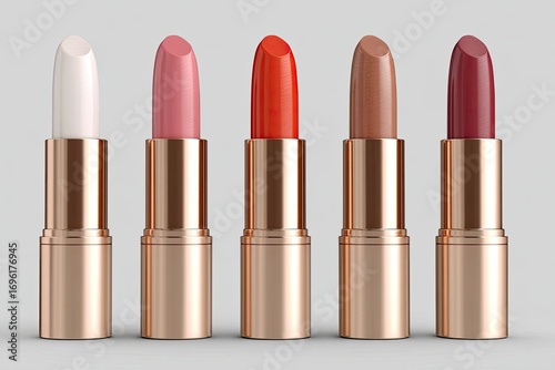 © Senang, Fototapeta premium Five lipsticks in various shades, displayed in a row against a light gray background. Each lipstick has a rose gold colored casing