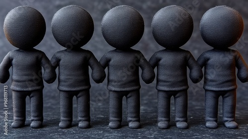 © Aris Suwanmalee, Obraz premium Five minimalist figurines stand in a line, symbolizing unity and collaboration against a textured dark background.