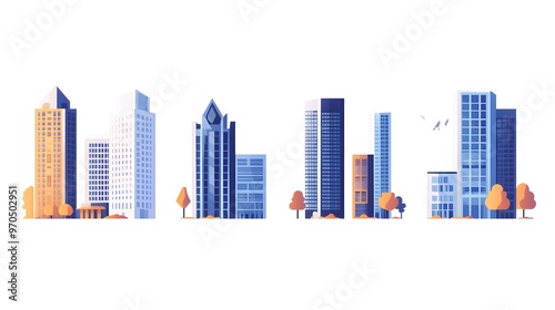 Obraz premium Five Modern Skyscrapers with Trees and a White Background