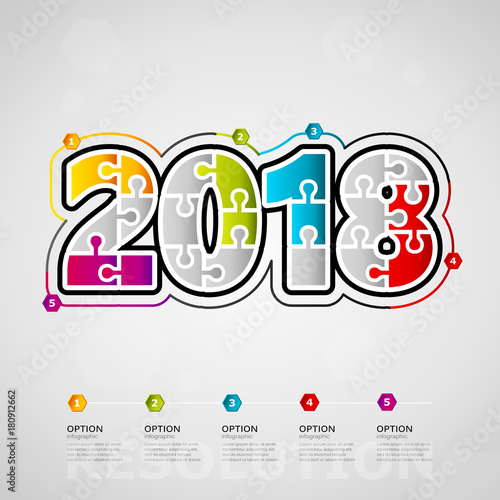 Fototapeta premium Five options 2018 timeline infographic design with text made out of jigsaw pieces