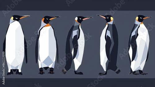 Obraz premium Five penguins standing in a row, each with distinct geometric shapes, against...