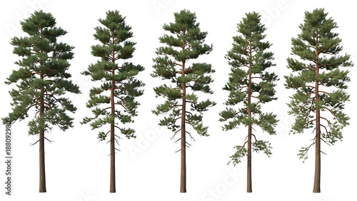 © Pupun, Obraz premium five pine trees isolated on white for architectural landscape rendering graphic design elements and natural environment visualization projects