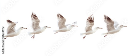 Obraz premium Five Seagulls Flying, White Background, Motion Sequence