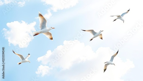 © Taley, Obraz premium Five Seagulls Soaring Through a Bright Blue Sky with Fluffy White Clouds