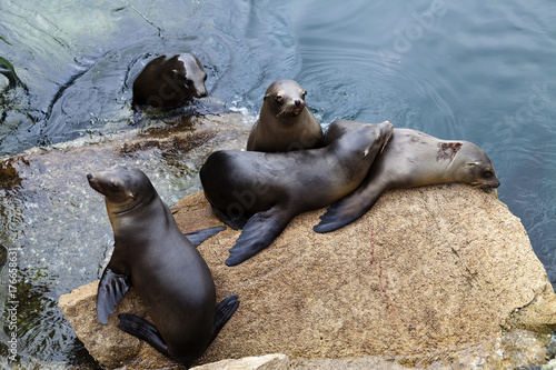 Naklejka premium Five Seals On Rock Monterey Bay California