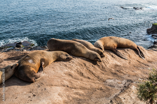 Fototapeta premium Five seals resting on a cliff at La Jolla Cove in La Jolla, California.