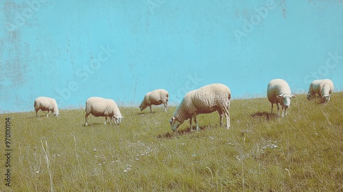 © raja, Fototapeta premium Five Sheep Grazing in a Lush Green Field Under a Blue Sky