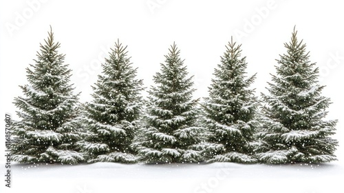 Fototapeta premium Five snow-covered evergreen trees on a white background. (1)