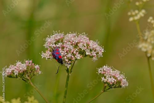 © Kristof Lauwers, Fototapeta premium Five-spot burnet moth on a common valerian flowers, close up - Valeriana officinalis