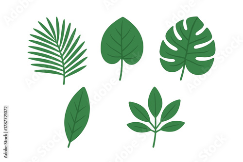 © typepng, Fototapeta premium Five stylized green tropical plant leaves isolated on white background