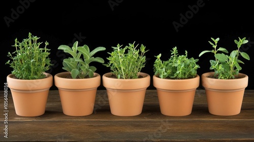 © Iswanto, Obraz premium Five terracotta pots with various herbs arranged on a wooden surface against a dark background.