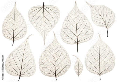 © Julianne, Fototapeta premium Five to seven pale sepia-toned dried leaves, brittle with skeletal venation & crinkled texture, flat lay on white, soft studio light, concept of scientific observation and natural beauty