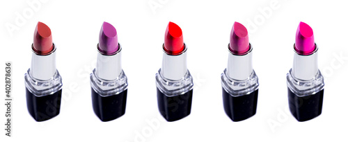 © pamela_d_mcadams, Obraz premium Five Tubes of Different Colored Lipsticks on a White Background