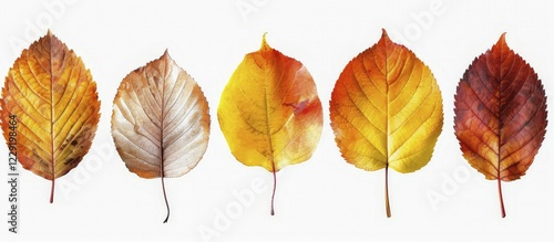 © Doukdouk/imageBROKER, Obraz premium Five varied fall leaves in shades of orange, yellow, and red displayed in a row against a white backdrop, AI generated